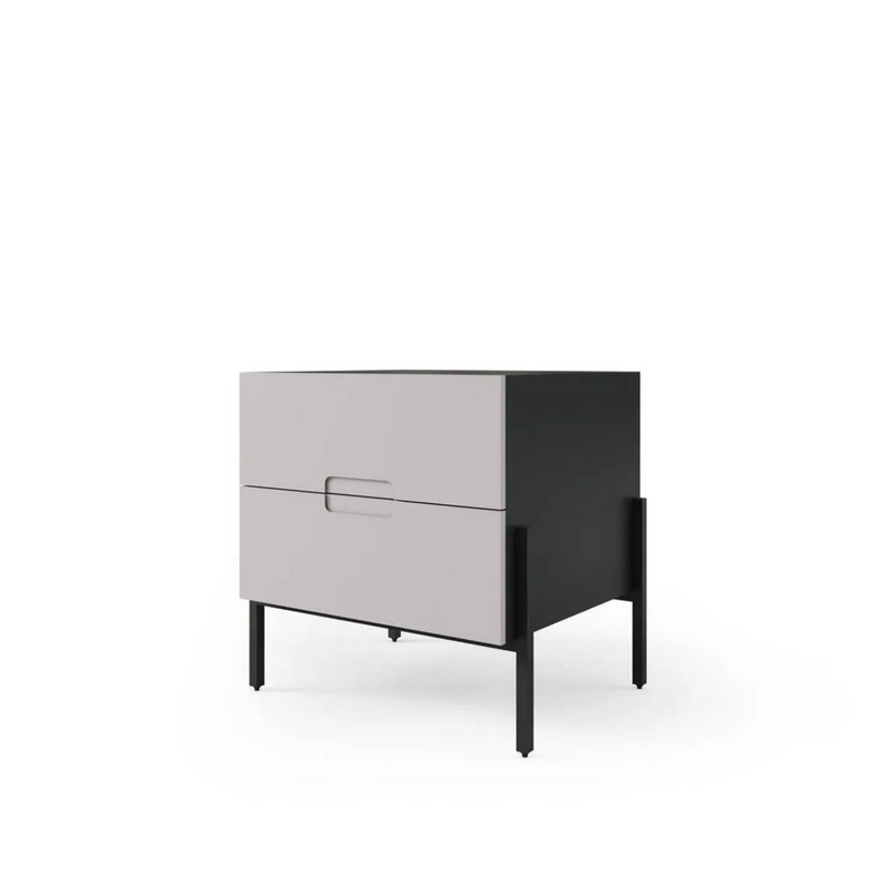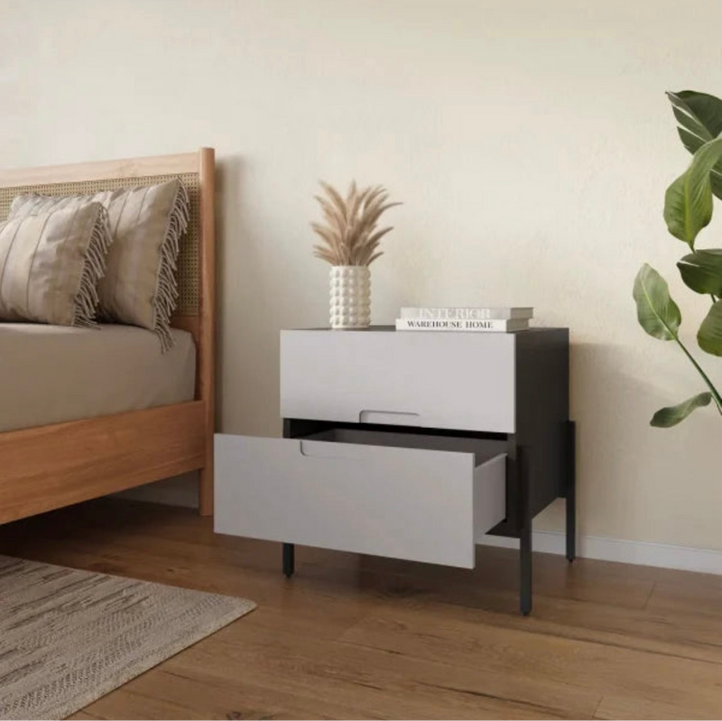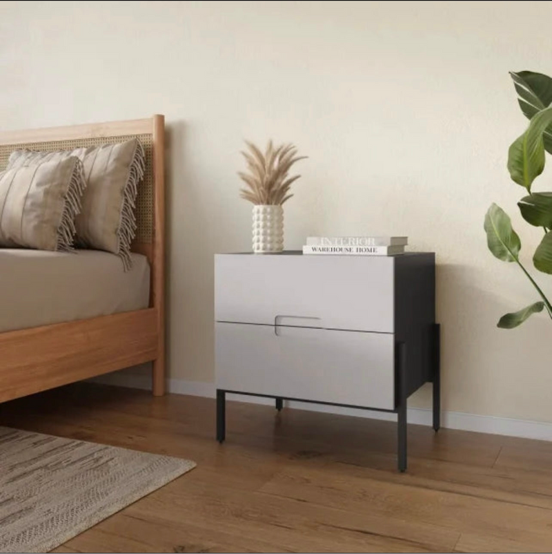 שידת צד מיטה בעיצוב יוקרתי, הכוללת שתי מגירות.