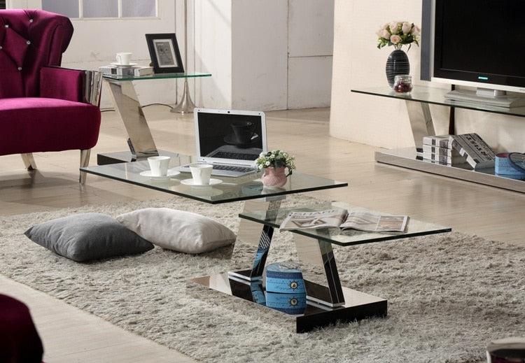 השולחן עשוי זכוכית מחוסמת משולבת מוטות ניקל, הזכוכיות מסתובבות על צירן וכך מידת השולחן גדלה.